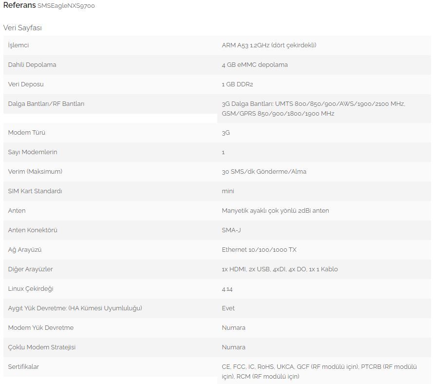 SMSEagle, SMS mesajlarını otomatik bir şekilde göndermek ve almak için profesyonel bir donanım SMS ağ geçididir. SMSEagle NXS-9700 3G, güvenilirlik ve stabiliteye odaklanılarak tasarlanmıştır. Yerleşik bir Linux, modern duyarlı web arayüzü, veritabanı arka ucu ve bekçi mekanizmasına sahip yerleşik 3G modeme sahiptir.